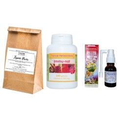 Die Packung enthält ätherische Öle von Eukalyptus und Ravitsara, bekannt für ihre antiviralen und dekongestanten Eigenschaften, sowie einen tröstenden Kräutertee zur Stärkung der natürlichen Verteidigung.