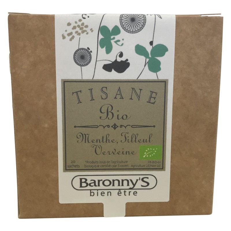 Mélange de menthe (Mentha), verveine (Verbena officinalis) et tilleul (Tilia). Ces plantes sont cultivées en bio et sont reconnues pour leurs propriétés digestives et relaxantes.
