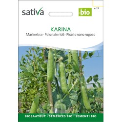 Le pois nain ridé Karina est une variété mi-précoce et vigoureuse, connue pour son excellent rendement et la qualité de ses gousses. Chaque gousse vert foncé contient 8 à 9 pois charnus, tendres et naturellement sucrés, idéals pour une dégustation fraîche, en soupe ou cuisinés.
